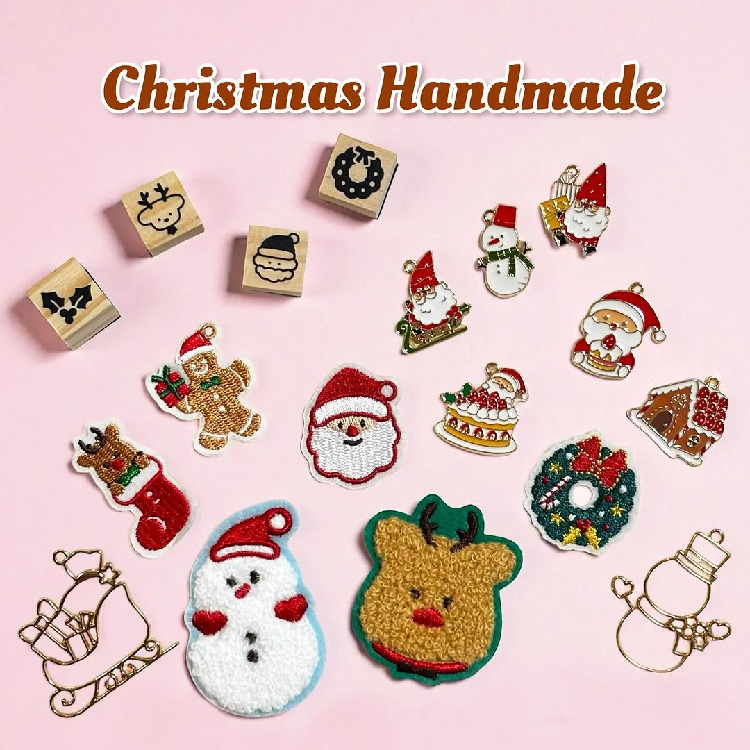 今回のアイテムは、クリスマスモチーフのチャームやワッペン、スタンプ、モールなどが揃ったシリーズ。どれも小ぶりで扱いやすく、初心者でも取り入れやすいのが特徴です。組み合わせ次第でアクセサリー、チャーム、ラッピング装飾など幅広く活用できます。
